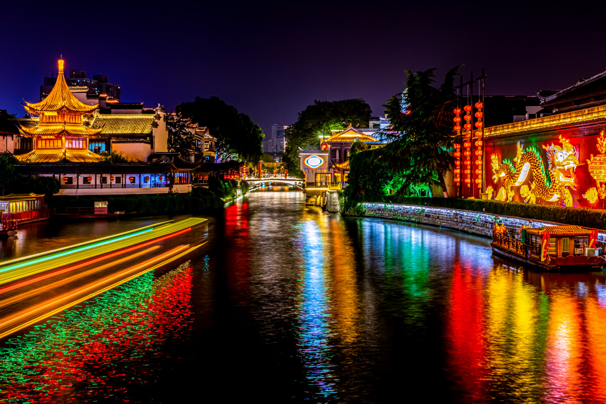 離開牛首山,我們前往充滿老南京風情的老門東歷史文化街區。青石板路蜿蜒向前,兩側是白墻黛瓦的明清風格建筑,濃郁的市井氣息撲面而來。大家或在老門東牌坊下合影留念,或走進沿街店鋪品嘗各類南京美食。晚餐后我們來到了夫子廟 - 秦淮風光帶。此時的秦淮河畔早已華燈初上,岸邊的古建筑掛滿了紅燈籠,燈光倒映在河水中,波光粼粼,美不勝收。我們沿著秦淮河畔漫步,看畫舫緩緩駛過,晚風吹拂,愜意十足。街邊的小吃攤前人頭攢動,糖芋苗、赤豆元宵的香甜氣息縈繞鼻尖,大家三三兩兩分享美食,歡聲笑語回蕩在秦淮河畔。